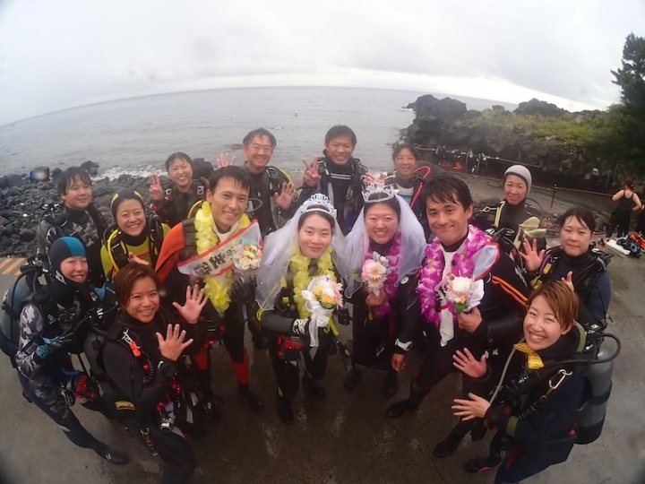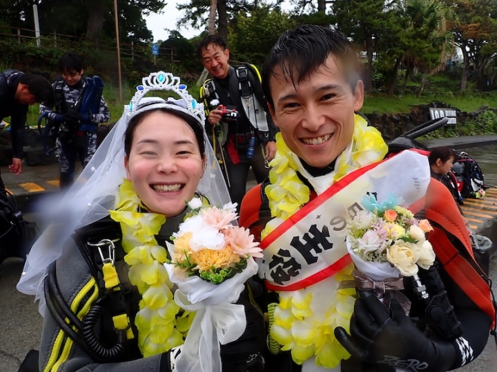 恵子先生が用意してくれたブーケやベールを身につけ、お祝いダイブをしました。