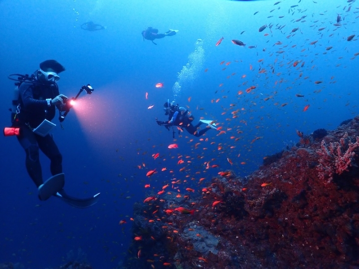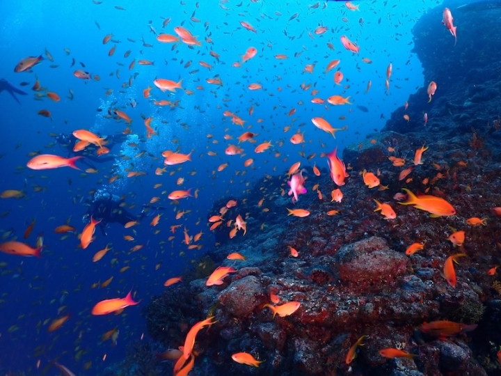 流れに逆らって、群れに突っ込んでいくワイドなダイビングも
