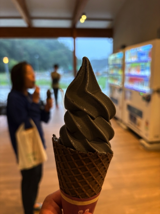 潜った後に食べたイカスミ真っ黒ソフトクリーム。美味しかった。