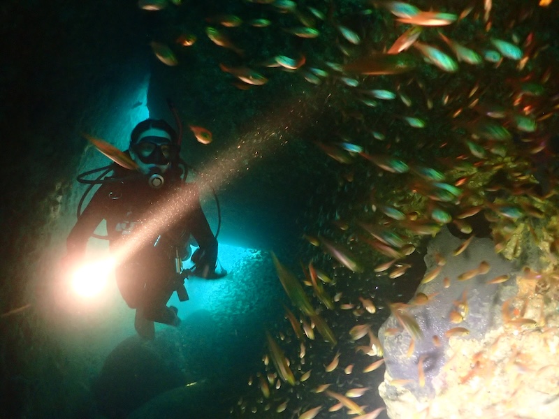秋になるとその洞窟内にはキンメモドキやクロホシイシモチと言った魚が